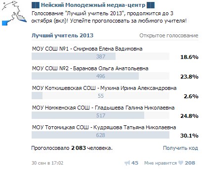 Конкурс завершён. За любимых учителей свои голоса отдали более 2000 человек. Голоса приходили не только из Неи и Нейского района, но и из других районов и областей страны (особенность виртуального конкурса - возможность привлечения в голосование интернет-сообщества).